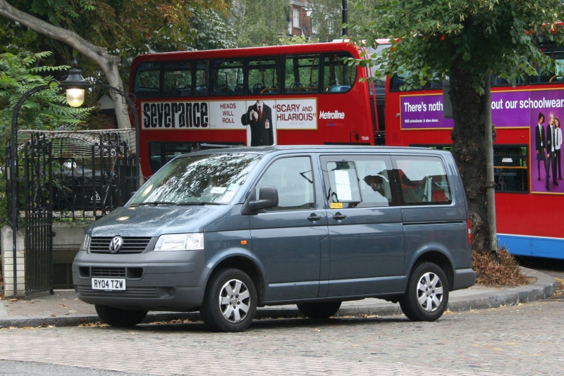 Details: The fleet of ex-Taxis assembled by Metroline appears to have been replaced by a smaller number of VW Transporter minibuses such as RY04TZW seen at the Hampstead Heath terminus of route 24 on 23rd August 2006. In the background can be seen one of the Enviro 400 buses that now form most of the allocation on this route. |