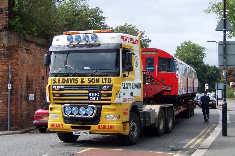 Details: The 1500th picture to be added to LTSVplus does not even show a service vehicle, nor a London-based vehicle. However, this view of S E Davis Haulage's DAF XF artic VX05JVA entering Acton Works on 31st August 2006 was felt to be special enough to mark the occasion. Navigating that load (which by the way is Victoria Line 1967 Driving Motor 3077) through the London Streets, and indeed the confines of the works, must have been quite a challenge! |