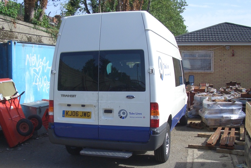 Details: Although it is barely visible in this view, Ford Transit van 5975F is notable for having its lettering altered on both sides to read Tube Lies! The high-roof crew van was parked in the compound at Finchley Central Station on 6th September 2006. |