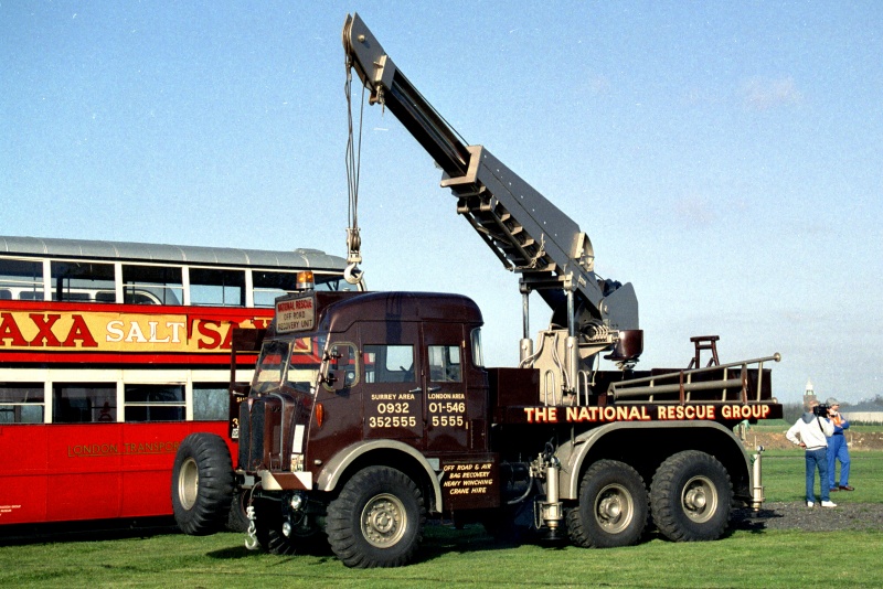 Details: Following disposal by London Transport in May 1981, AEC Militant Master Breakdown Tender 1456MR passed to The National Rescue Group in late 1983, and was repainted in this brown livery for use from their Brooklands depot. It lasted in this role until 1988 and has since been in preservation. In April 1993 it was being rallied in as-withdrawn condition, showing that the front ballast box had been removed and a spare wheel mounted on the bumper. This view is also interesting for showing the jib raised and fully extended. |