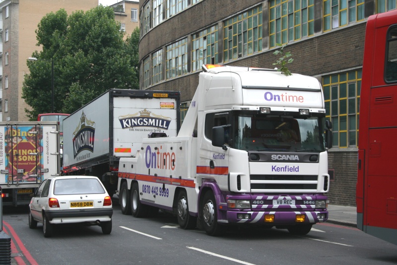 Details: OK, so this vehicle is not actually towing a bus, but the location will be familiar, and the firm illustrated certainly often do work for LBSL. Ontime Kenfield V8REC is a 4-axle Scania 144G, very similar to their V8TOW, while the personalised registration is rather like Spearings T1REC. It was seen towing a bread van past Griffith House on 23rd August 2006, and appears to have been fitted with a roof-mounted tree! |