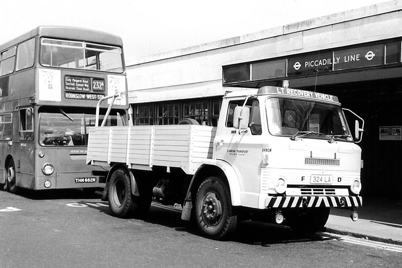 Details: Ford D1110 towing lorry 1990F looks quite fresh in this view taken at Hounslow West Station, suggesting that the date would be early 1977. As was often the case, it appears to be in attendance to a DMS-class bus. 1990F was based at Southall but moved to Merton before disposal in 1985. |