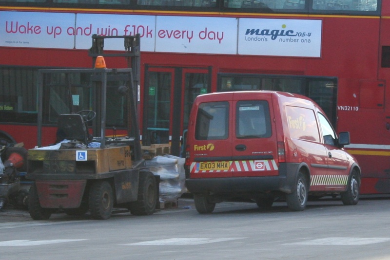 Details: Just visible in this view of First London Vauxhall Combo van EX03MHA at Dagenham depot on 8th October 2006 is the fleetnumber applied to the fuel filler cap (61). There can't be too many wheelchair-accessible fork lift trucks about! |