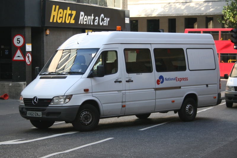 Details: As Damon said, here's something different! Seen entering Victoria Coach Station on 10th September 2006, this Mercedes-Benz Sprinter minibus may be a service vehicle, or it may not! X162ENJ was one of many such vehicles bought by Speedlink/Airlinks and used for Airport transfer work. Some were registered as PSVs, while those used airside had to have flashing roof lights. Airlinks became part of the National Express operation and their current logo is carried, with traces of Airlinks lettering also visible on the luggage compartment panel. The current role of this vehicle is not clear. |
