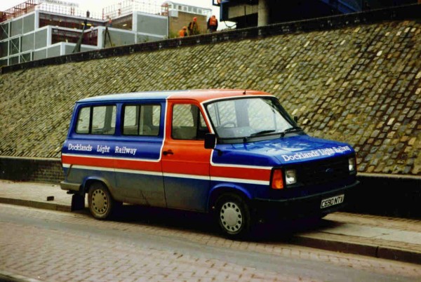 Details: The Docklands Light Railway initially operated under the auspices of London Transport, and it was allocated its own service vehicles from the main CDS fleet. At least some of these carried the livery of the trains themselves, namely blue with a red band, edged in white, and extended over the doors. Shown here at Crossharbour is 3337F (C690NTV), a Ford Transit minibus delivered in 1986. The DLR operations were later separated and no longer use CDS vehicles. |