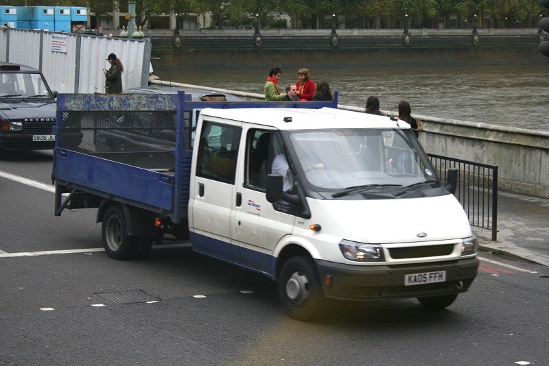 Details: Seen from the top deck of a bus crossing Westminster Bridge on 26th October 2006, this is Metronet 5815F, a Ford Transit dropside truck with crew-cab and tail-lift. The mesh tail-lift that has featured on a number of recent deliveries is clearly visible. |