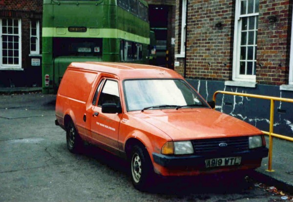 Details: Ford Escort vans have been used for lighter duties for many years. Shown here in the unlikely surroundings of Dorking bus garage (which ceased to be part of London Transport in 1970) is 3232F (A919WTL), lettered for the Ticket Machine Works. Behind the van is an ex-Glasgow, Alexander-bodied Leyland Atlantean, by then owned by London Country South West. |