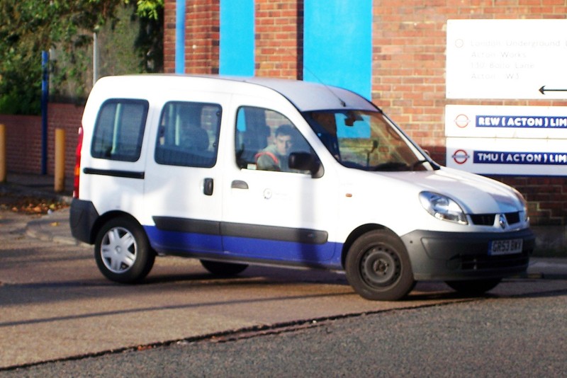 Details: Although slightly fuzzy, this picture had to be included as it shows the front of a Kangoo! Regular visitors will know why this is significant! Tube Lines 5575R was leaving Acton works on the morning of 27th October 2006. Note that the grille design is different to earlier 5188R. |