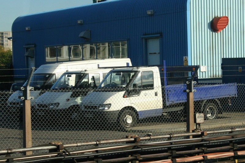 Details: Between the main lorry yard and Acton Town Station there are a couple of other buildings to the North of the railway line at which SVs can be seen and sometimes photographed. The building here is believed to be Frank Pick House, although I doubt he would have approved the architectural style. Parked in front on 3rd November 2006 were a trio of Ford Transits, with new dropside 6065F to the fore. This is a basic version, while 5703F behind has the additions of a crew-cab and tail-lift. The van at the rear is thought to be 5598F. |