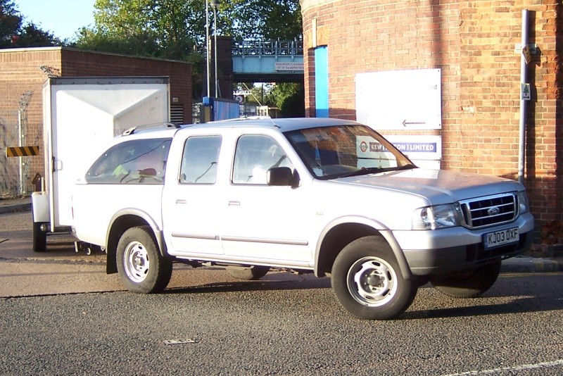 Details: Un-numbered Ford Ranger KJ03DXF has been illustrated here before, and the low sun in this shot taken on 27th October 2006 does obscure some of the detail. However, this view has been included as it shows it pulling trailer T63. Listed officially as a Challenger G13850 trailer in blue, it is evidently white, and appears to be similar to T64. |