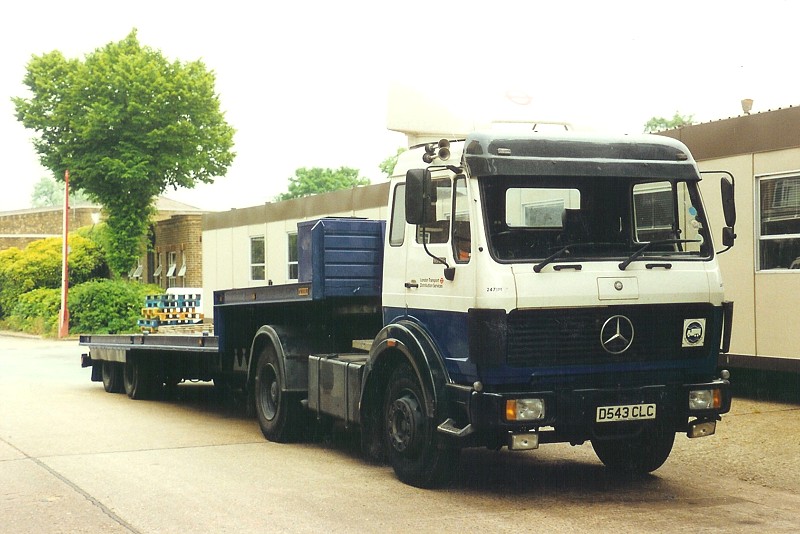 Details: Four Mercedes-Benz SK-series artic trucks have been used as service vehicles but all had subtle differences. 2471M was acquired second-hand in 1988 and had a sun-visor and airfoil very like similar 2474M. However, 2471M was to an earlier design of the SK-series, having a flat-bottomed cab window with deeper quarterlight, where 2474M's was sloped. 2472M was also to the earlier design but was the only one to have a day-cab (and no sun visor), while later design 2551M was unique in having three axles and the final design of grille. In this view of 2471M taken at Acton Works on 28th May 1992, another recognition feature is visible in the air-horns mounted above the driver's door. While on the subject of recognition, York trailer YT28 can be distinguished from broadly similar YT29 by having a different style of headboard and lacking wheelarches and beaver-tail. Both trailers originally had side panels. |