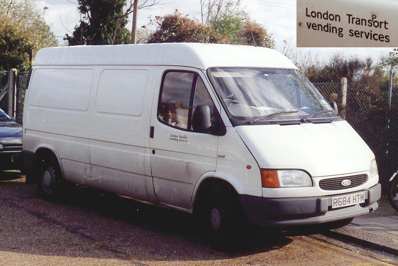 Details: Before the service was finally contracted out, London Underground ran three Ford Transits from a depot at Bow Road to service the vending machines at stations. Like 4844F seen at Stanmore Station, these all carried plain white livery. However, the most notable aspect of this vehicle was the misspelling of the cab-side lettering, which reads London Transort, vending services. The missing letter p had been added as seen in the inset. |