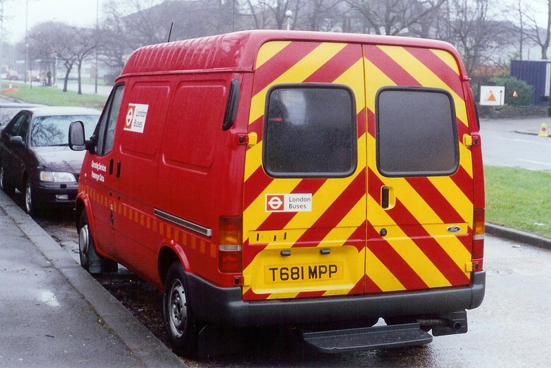 Details: Ford Transit van 4981F was delivered in plain red as seen in this earlier picture. It was soon adorned with London Buses lettering and graphics for its use by the Passenger Data team. |