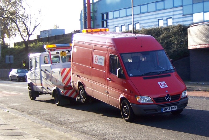 Details: A Mercedes towing a Mercedes! 5798M passed Ray in this rather ignominious manner on 18th November 2006. The location is Bollo Lane (Frank Pick house is visible in the background), and it was presumably being taken to Acton Works for attention. London Buses (and London Underground) vans have often been seen under repair at Smallbills Garage on Bollo Lane, but this ensemble has already passed their premises. |