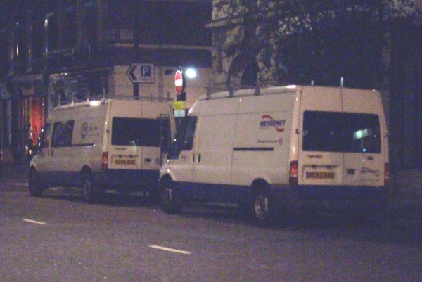 Details: This picture was not quite so good but has been included as it shows the logos of both of the main Infracos. Taken on Baker Street on 6th December 2006, the two mid-height Ford Transit vans are Tube Lines crew van 5603F (from Stratford) and Metronet 5393F. Although both vans have roof racks, only 5603F has an access ladder. |