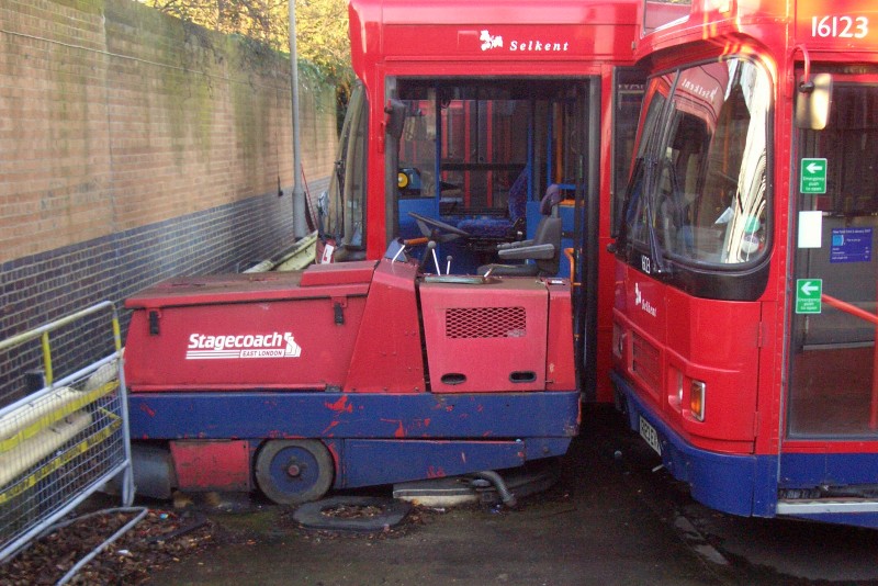 Details: Bromley has a small garage with a large yard over the road. Among various buses parked there on December 16th 2006 was this sweeper, evidently out of use. It still carries the Stagecoach logo although this is interestingly for East London rather than Selkent. Parked behind is Volvo Olympian 16123, one of two step-entrance buses retained here for schools contracts. |