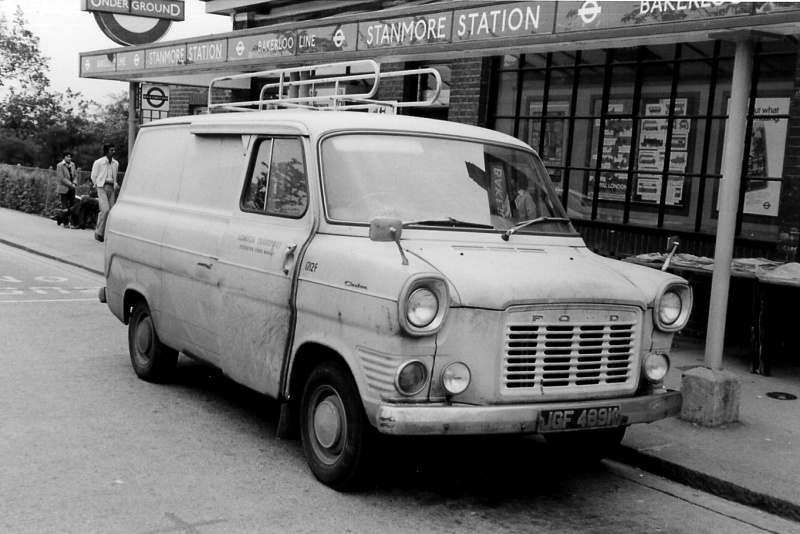 Details: Looking slightly worse for wear, this is Ford Transit van 1712F, some way into its 10-year life as a London Transport service vehicle. Stanmore Station was still on the Bakerloo line back then, and the van has one of those small roof racks that look they would have made great toboggans! |