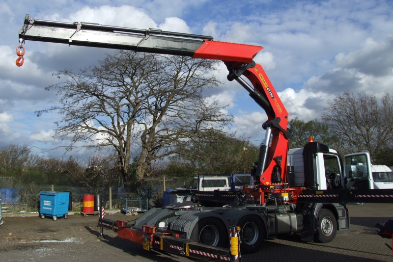 Details: Actros 2591 at Acton on the 6th March 2007 again. Once the main crane was raised, the four telescopic sections were extended. The third section was extending as this picture was taken, and the need for the widely spread stabilisers was becoming obvious. |