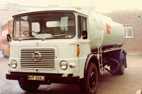 Details: A special number for a special vehicle, and one which I actually got tired of seeing as a kid! 2000S (WVP558J) was a Seddon 2500-gallon fuel tanker, built in 1971 and taken into LT stock in 1976. It was habitually to be found in Stockwell bus garage, as in this picture, and was the only Seddon ever owned. |