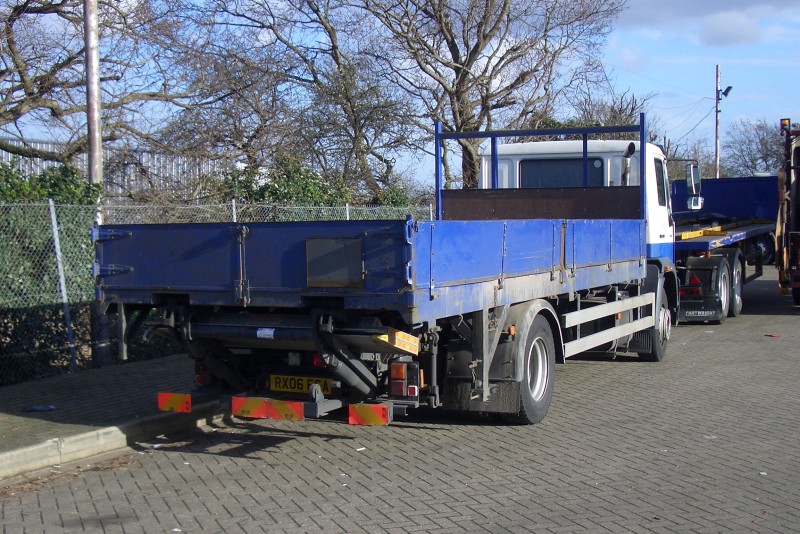 Details: Most of the demountable lorries in the Distribution Services fleet are fitted with tail-lifts, though due to the variable bodywork carried, these have to be of the fold-up and tuck-under type. The mechanism is clearly visible in this view of MAN LE14.220 2587 at Acton Works on 6th March 2007. It was carrying Locomotors dropside body DB10 at the time, and was parked behind Cartwright trailer T74 which has rails fitted to allow the carriage of railway bogies. |