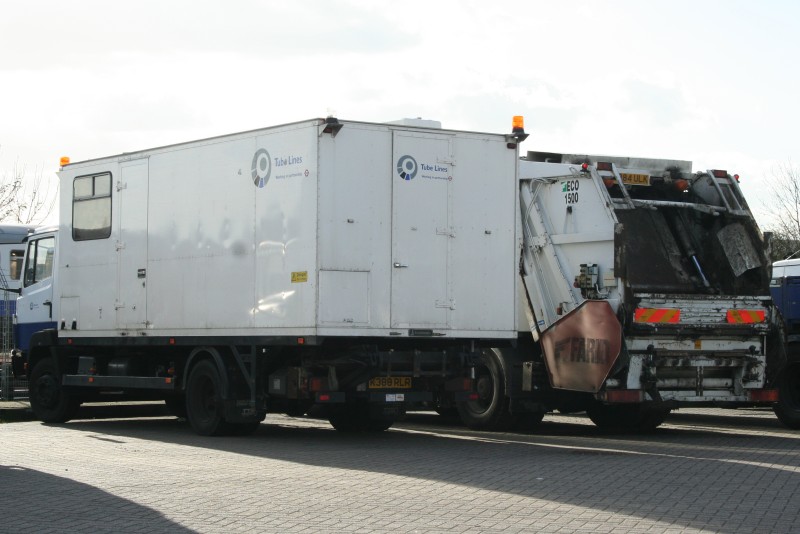 Details: While most of the demountable bodies in the Tube Lines fleet have their numbers displayed somewhere on the exterior, this one notably does not. We are fairly sure however that it is DB08, a mobile office body built by Locomotors in 1993. On 6th March 2007 it was mounted on Mercedes-Benz 1114 lorry 2540M, and parked next to Econic dust-cart 2576M in the lorry yard at Acton Works. |