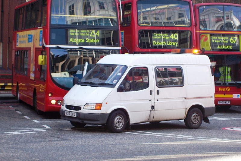 Details: When this anonymous van was seen in Thamesmead (south east London) in April 2005 it was presumed to have been sold by Arriva, and no other sightings were reported. However, on 14th March 2007 it turned up at Aldgate Bus Station, evidently still in use, and therefore one of the oldest vans in the Arriva fleet. The light-bar and spot-lights suggest that it was used as an engineering support vehicle. |