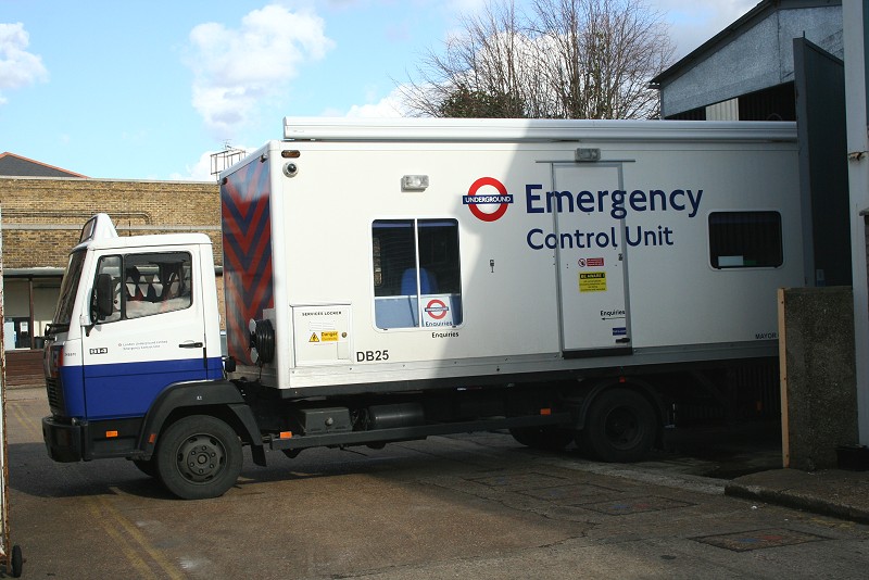 Details: A new Emergency Control Unit demountable body was delivered in November 2006 to replace DB7. Built by Lyntons to a similar configuration but with updated equipment, the new pod is numbered DB25, and is semi-permanently fitted to Mercedes-Benz 814 truck 2488M. Although over 15 years old, this chassis has low mileage and is expected to be upgraded to meet forthcoming emissions regulations. The combination is kept in a dedicated shed at Acton Works, where it was photographed on 6th March 2007. |
