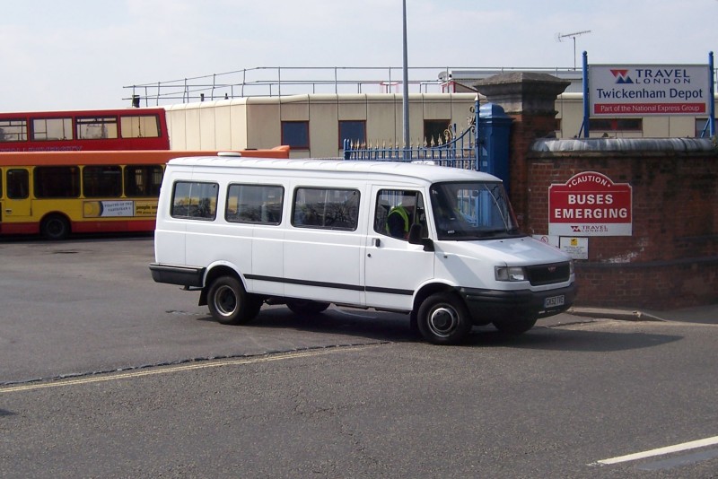 Details: With no lettering or logos visible, GK52TVE could easily have been missed as a service vehicle if seen elsewhere. Leaving the Twickenham (Fulwell) depot of Travel London on 7th April 2007, it was one of two low-roof LDV Convoy minibuses acquired for crew ferry duties. The bus in the background is an East-Lancs bodied Dart originally in the Wings fleet. |