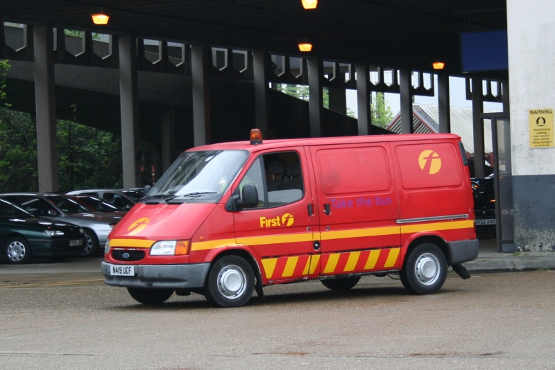 Details: Originally carrying a white and orange livery and the fleetnumber 3001, N419UCF of the First Berkshire fleet had been repainted red and yellow by the time this photo was taken at Slough Bus Station on 24th April 2007. The vehicle is a short-wheelbase Mk5 ('smiley') Ford Transit van. Note the unusual, and barely visible, exhortation to 'Take the bus'. As this van probably only appears when a bus has broken down, this form of promotion seems a bit odd! |