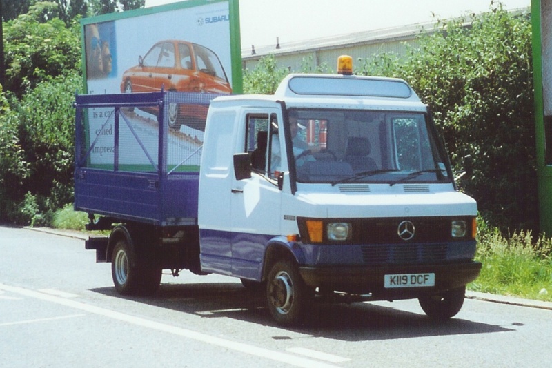 Details: Just about to start its career with LUL, Mercedes-Benz 410D truck 2542M was seen on delivery on Bollo Lane in August 1993. Note the crew-cab and rubbish cage fitted to the dropside body. The cage was subsequently removed though the mesh-fitted front bolster was retained. It would appear that either the body is wider than the cab, or it is fitted further back than normal. |