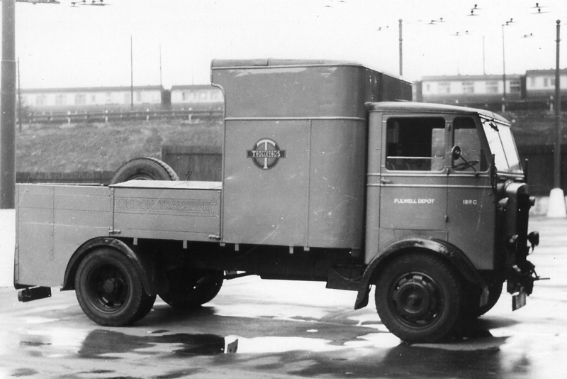 Details: 189C was new in March 1936 as the first Leyland Cub Trolleybus Rescue Truck, and it could immediately be recognised by its flat roof. The 6 similar Cubs that followed later that year had the same rounded roof as seen on the Albions. Although lettered for Fulwell Depot, this photograph is surely taken at Stonebridge Park depot, with the BR carriage sidings in the background. This depot still stands although now in alternate use, and at least one trolleybus traction standard pole is still visible from passing trains. |