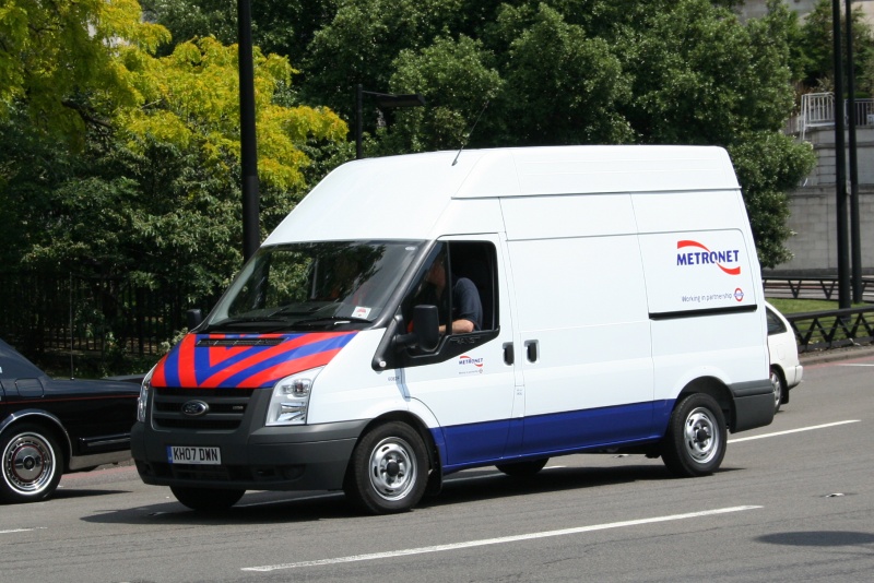 Details: A lucky find by Scott on 1st June 2007 was this new Ford Transit heading up Park Lane. It carries Metronet markings and ERU-style chevrons on standard LUL livery. This is a very rare example of the medium-wheelbase, high-roof Transit in an underground-related role. LBSL have had many such vehicles, but LUL vans tend to be of the long-wheelbase variety. For those interested in such things, the key recognition points for this variant are that the side door runner extends right to the rear, and that there is a seam half-way up the roof sides. |