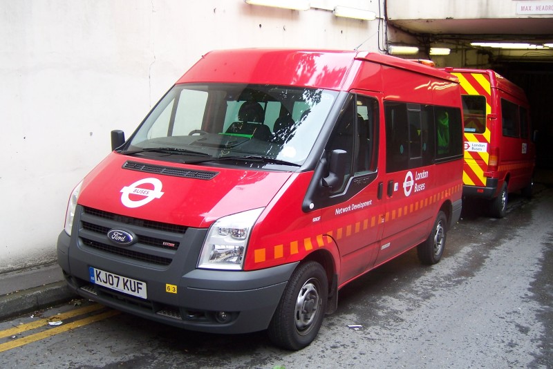 Details: 6063F was one of two Ford Transit 12-seat minibuses delivered to the Passenger Data department of London Buses in March 2007. It was photographed at Victoria Coach Station on 22nd June that year. Note the numbered stickers on the front bumper. Earlier vehicles operated by this team also carried these (including 4524F and 5540F) but this is the first time they have appeared to relate to the vehicle fleetnumber. |