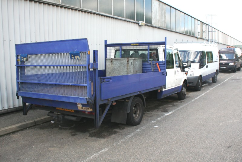 Details: This picture taken at Northumberland Park depot on 20th July shows Ford Transit dropside 5763F operated by the Victoria Line Track Manager. Note the huge spanner stored behind the cab, and the mesh-floored Ratcliff tail-lift. |