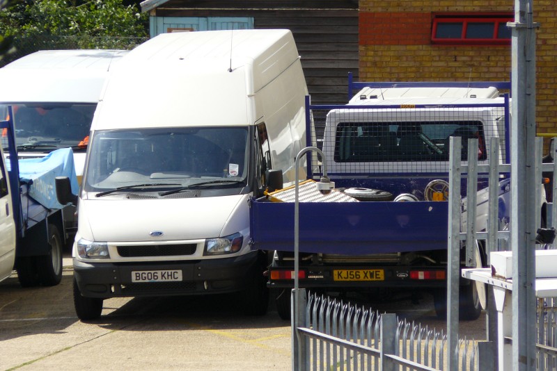 Details: Taken from West Cromwell Road, this view of vehicles parked at Lillie Bridge on 28th July 2007 shows plain white Ford Transit van BG06KHC next to dropside 5986F. The unliveried van has been in the Metronet BCV fleet since May 2006. Note also the Metronet-branded tarpaulin on the adjacent dropside truck. |