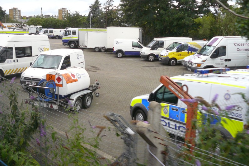 Details: The south end of the lorry yard at Acton Works is usually used for smaller vehicles, and a very interesting selection was found on 28th July 2007. From the left, the vehicles include a Ford Transit crew van of contractor Fastline, Transit Connect 5839F, mini tanker trailer T70 and one of several new Transit Connects for the British Transport Police. The back row includes newly delivered ERU truck 2600, two box trailers, two normal vans, a Vauxhall Vivaro in TfL Safety Camera Partnership livery, and an Iveco Daily van liveried to promote the CrossRail project. The Vivaro is believed to be the former 5452V. |