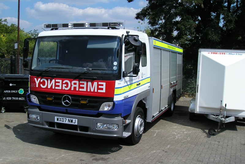 Details: A smart view of recently-delivered Mercedes-Benz Atego 2600 at Acton Works on 1st August 2007. To the left of the reversed EMERGENCY lettering on the front panel are the initials JDC, this being the bodywork supplier, John Dennis Conversions. The Tow-a-Van trailer alongside is thought to be T75 dating from 2005 but not previously seen or reported. |
