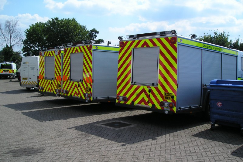 Details: The modern-looking Mercedes-Benz Atego rescue tenders delivered to the ERU fleet in summer 2007 have rather old-fashioned rear ends. The side shutters extend the full length of the bodywork, hence the rear access is only to the centre portion. They also look a bit square-cut. Note that the nearest vehicle does not have the additional reflective chevron panels seen on the other two. This picture was taken on 1st August 2007. |