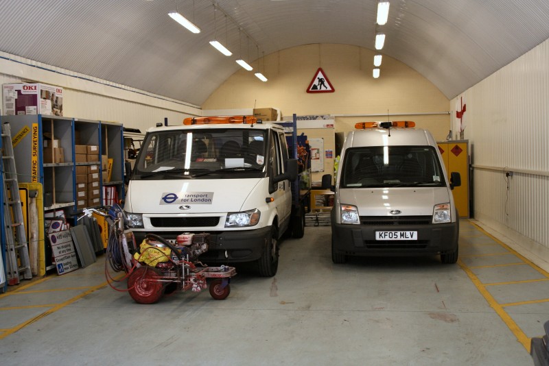 Details: Another view of the Carlisle Lane depot used by Transport for London, taken (with permission) on 6th August 2007. Resident at the time were second-hand Ford Transit 5728F (transferred from Metronet and hence in LUL white/blue livery), and Connect 5774F in as-delivered silver livery. Note how clean and tidy the floor is kept. |