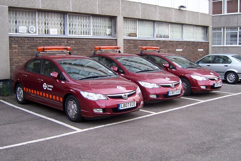 Details: As well as the new ERU trucks, summer 2007 also saw the arrival of the first Honda Civic hybrid cars for London Buses. These stand out due to their sleek design and maroon livery. Three were found parked at the back of Sycamore House (Thornton Heath) on 28th September 2007, with 6299H nearest the camera. |