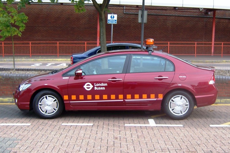 Details: They're not red, they're maroon, although they're also green! London Buses' new Honda Civic hybrid saloon cars are environmentally friendly, and very sleek. This is 6309H at Eltham on 12th August 2007. Pictures like these are very useful for making vehicle icon graphics! Thanks Ray. |