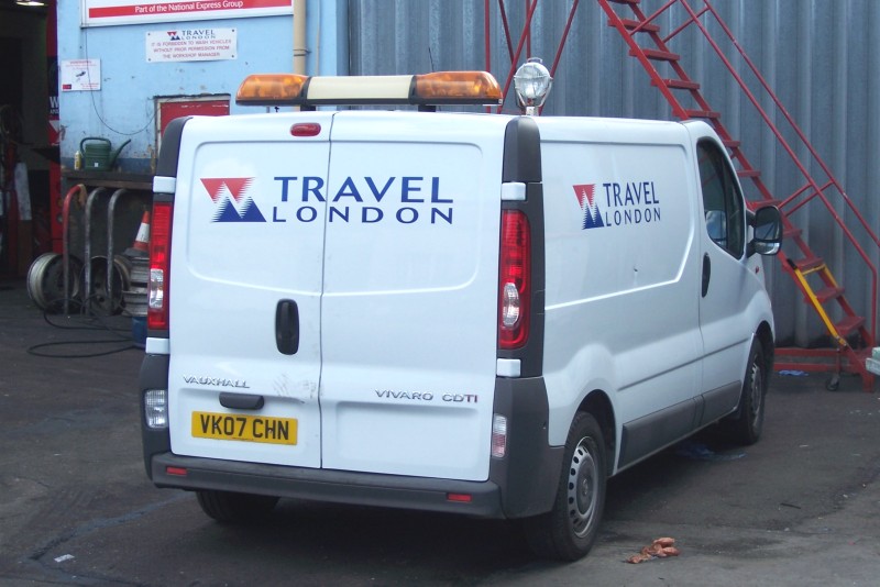 Details: Travel London operates a very varied fleet of service vehicles, due in part to the fact that various operators were taken over. The newest vehicle at present (late 2007) is Vauxhall Vivaro van VK07CHN, seen at its home base of Battersea. |
