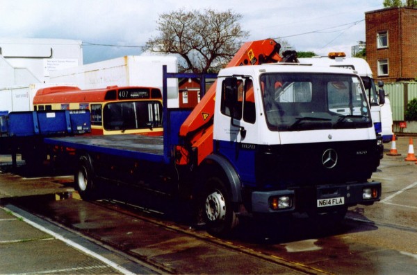 Details: Flat-bed trucks are comparatively rare in the current fleet, trailers, dropsides and demountables being more common. Shown here is 2553M (N614FLA), a Mercedes-Benz flat-bed truck with crane. In the background is a flat trailer and the Leyland National bus which was used as a mobile shop by the London Transport museum. |