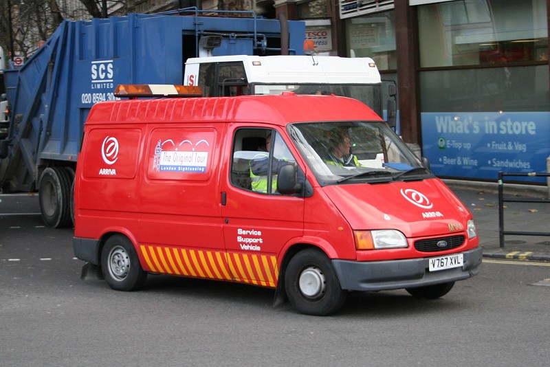 Details: This Ford Transit van has served the Arriva Tour fleet since at least 2003, and has carried two liveries and two fleetnumbers in that time. Now numbered MV1 and repainted red with logos and yellow stripes, it was seen at Northumberland Avenue in late 2007. |