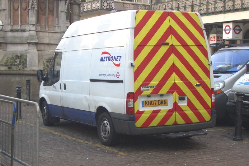 Details: Ford Transit van 6082F was found parked on the forecourt of Charing Cross Station on 20th December 2007. This high-roof, medium wheelbase van is used by Metronet and has red/blue chevrons on the front and, as seen here, red/yellow ones on the rear. |