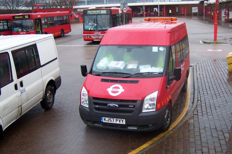 Details: The Passenger Data department of London Buses maintains a modern fleet of minibuses to ferry staff to and from survey locations. An addition in autumn 2007 was Ford Transit 6240F, which Ray found at Eltham Bus Station on 21st January 2008. Recent changes in legislation mean that all minibuses with more than 9 seats have to be fitted with tachographs. Most of the 12 and 15 seaters in the service vehicle fleet are having seats removed to be compliant. |