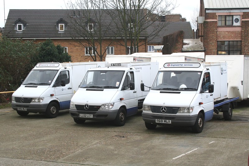 Details: A more conventional view of the three Mercedes-Benz Sprinter mobile generators at Lillie Bridge on 23rd January 2008. Newer 2584M (in the centre) was the last member of the current owned fleet to be illustrated on this site. As can be seen, it has a different grille design compared to its two older sisters, and also lacks the headboard and company logos. Curiously, the Petbow generator has the older LUL Engineering Services lettering, while the two others both have Tube Lines logos. All three vehicles are used by the 'Ventilation' department, and work with three Cobul trailers. |