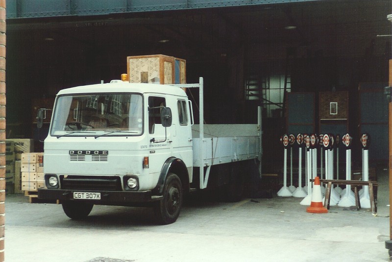 Details: A classic view looking into the loading bay at Parsons Green. Taken in the early 1980s, it shows early Dodge Commando lorry 2307D, which remained in stock until 1990. This vehicle was listed as having a crane fitted but this is presumably hidden behind the cab. Note the dolly stops to the right. |