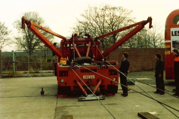 Details: A rear view of Leyland Freighter bus recovery truck 2416L shows the original, complex arrangement of jibs. It is not known what exactly is going on in this shot but the vehicles were equipped to right overturned buses as well as undertaking more basic towing duties. |