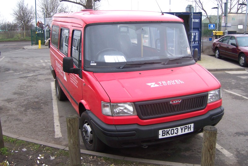 Details: Travel London acquired 6 former Royal Mail LDV Convoy minibuses during 2007, including BK03YPH seen at Beddington garage on 15th February 2008. This example was given full Travel London lettering but does not appear to carry its newly allocated fleetnumber of 8967. Traces of its seven-digit Royal Mail fleetnumber can just be made out above the windscreen on the driver's side. |